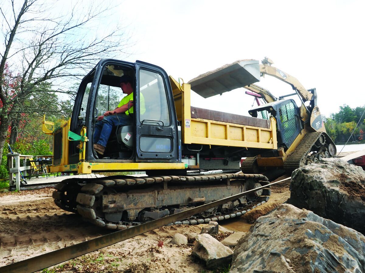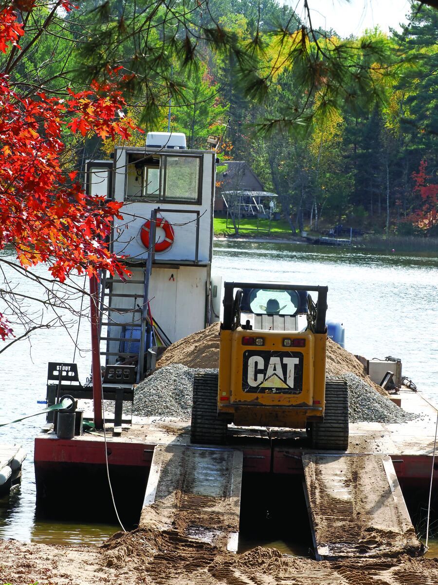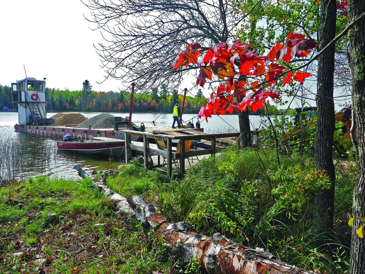Each barge load typically carries about 30 cubic yards of sand along with the necessary machinery for the site. “If the property isn’t far from a landing, we’ll drive our loaded quad-axle dump trucks right onto the barges and haul them to the site,” Viita says. “If it’s not near a landing, we dump the sand onto the barge, then at the landing a skid-steer loads it into a tracked truck that brings it to the mound site. Usually it’s three solid days of barging equipment and materials.”