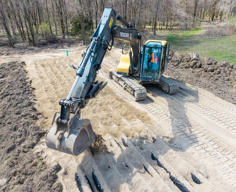 Ben Martin, owner of B&E Excavating, uses his Volvo EC140D excavator to place sand over seven rows of Advanced Enviro-Septic treatment-dispersal pipe (Infiltrator Water Technologies).