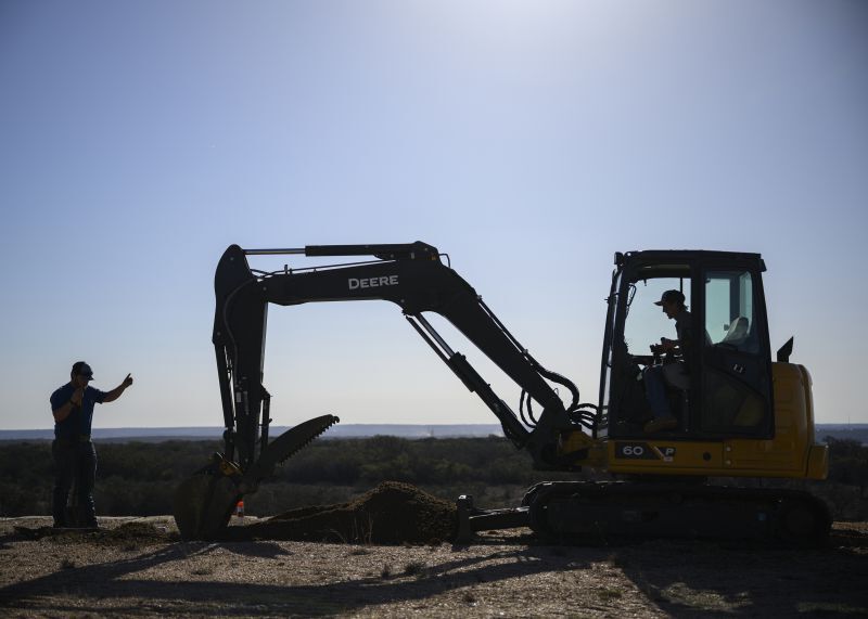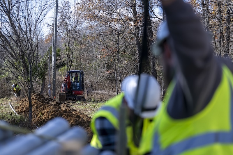 S&M Nix Enterprises operator Levi Senn in a Kubota KXO 40 mini-excavator digs a trench to install underground power to a home while Shelby Watson prepares the pole and conduit in the background, while Trent Wilson and Karson Nance push cable into a conduit.