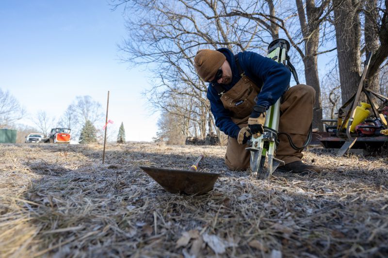 Hack Excavation crew member Matt Standafer prepares a tripod with a laser.
