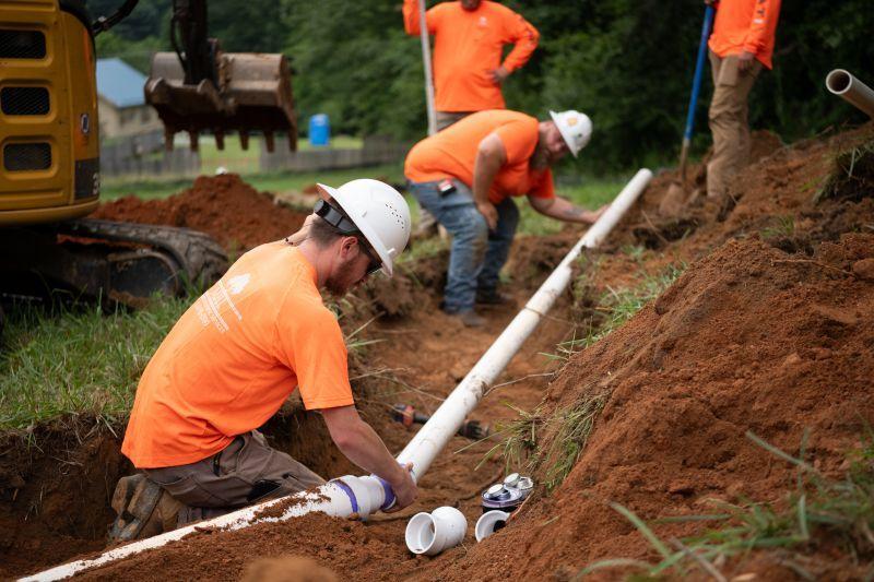 MHI Contractor & Septic Services septic foreman Tyler Creech and crew member Brandon Holbert fit PVC pipe for a drainline.