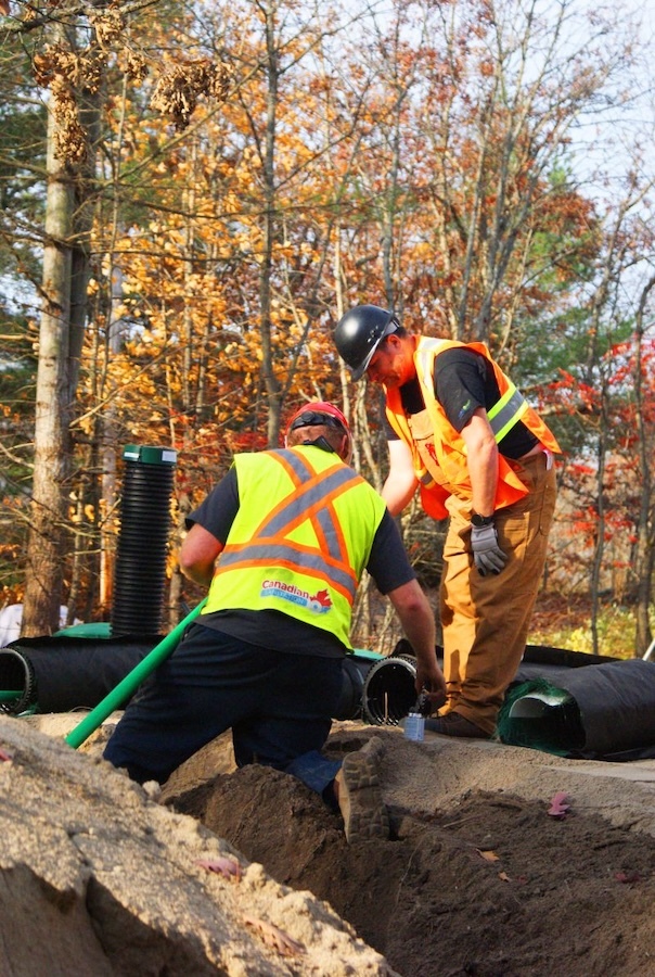 Ryan Thomas from Make-Way Environmental Technologies assists Canadian Sanitation owner Brad Corey as he installs a weeping bed.