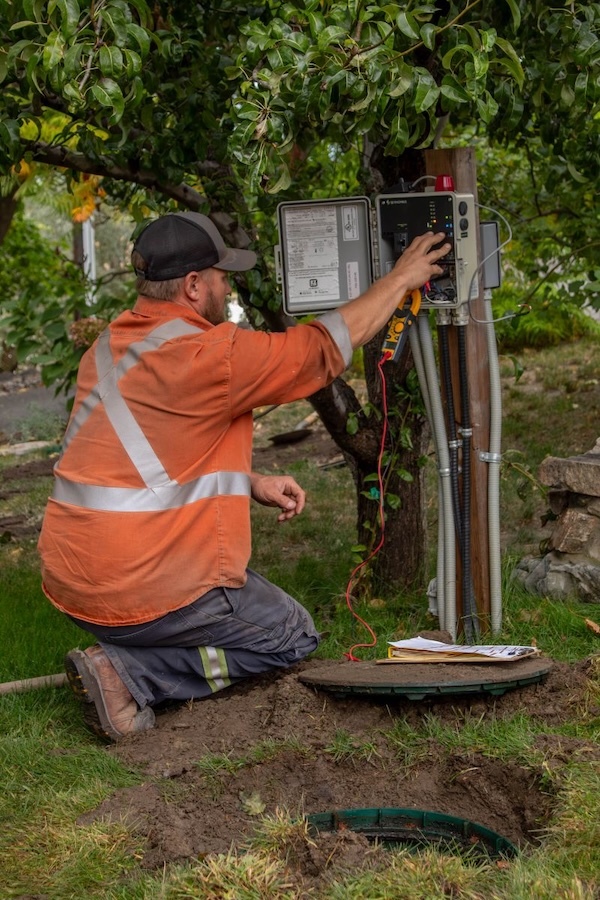 SBC Septic Services’ Jesse Bradley works on a system control panel.