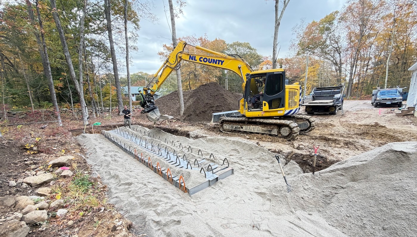That makes compact drainfields essential for New London County Septic & Excavation, serving southeast Connecticut and southwest Rhone Island. The company’s go-to drainfield solution is the GST Leaching System from Geomatrix Systems.